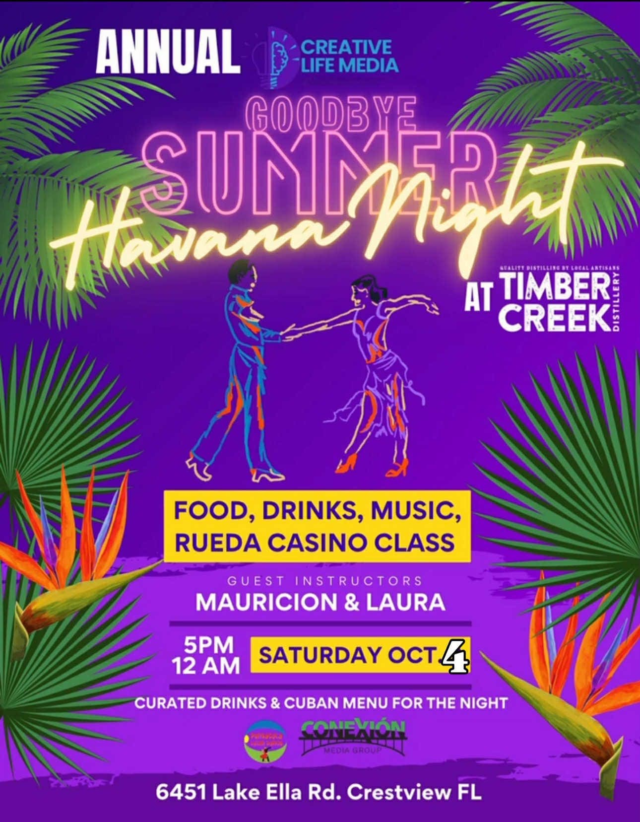 Hog roast salsa dancing was the centerpiece of Olde Havana Night, a Cuban-inspired dinner and music event hosted at Timber Creek Distillery in Crestview, Florida. The night combined a traditional Cuban hog roast, handcrafted rum cocktails, and Latin dance music in an open-air farm setting in the Florida Panhandle.
